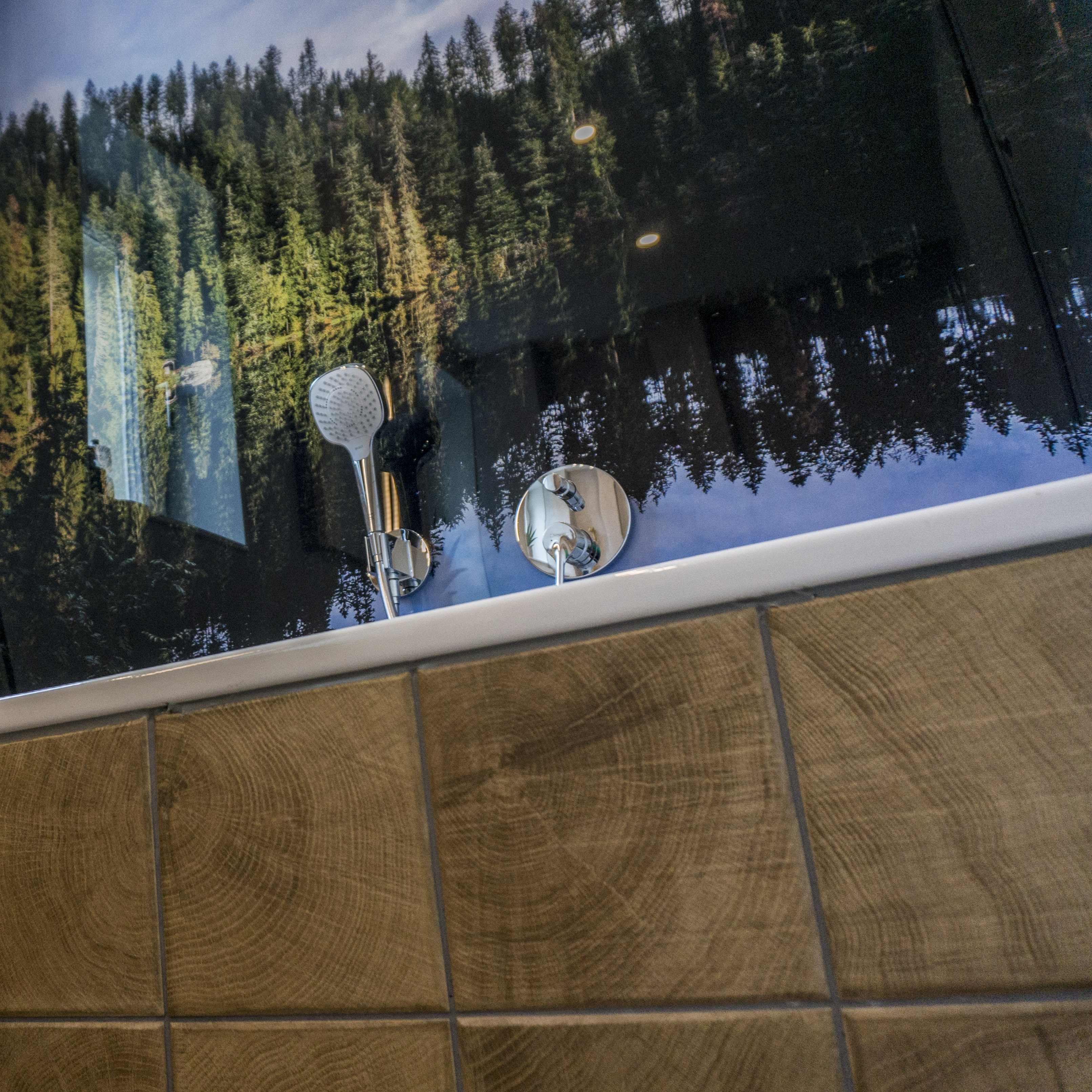 Bad mit Fliesen in Holzoptik Was aussieht wie massive Holzdielen sind eigentlich Fliesen. In Kombination mit den Dekorfliesen in Balkenoptik entsteht so ein Gesamtbild das an massiven Holzbau erinnert.