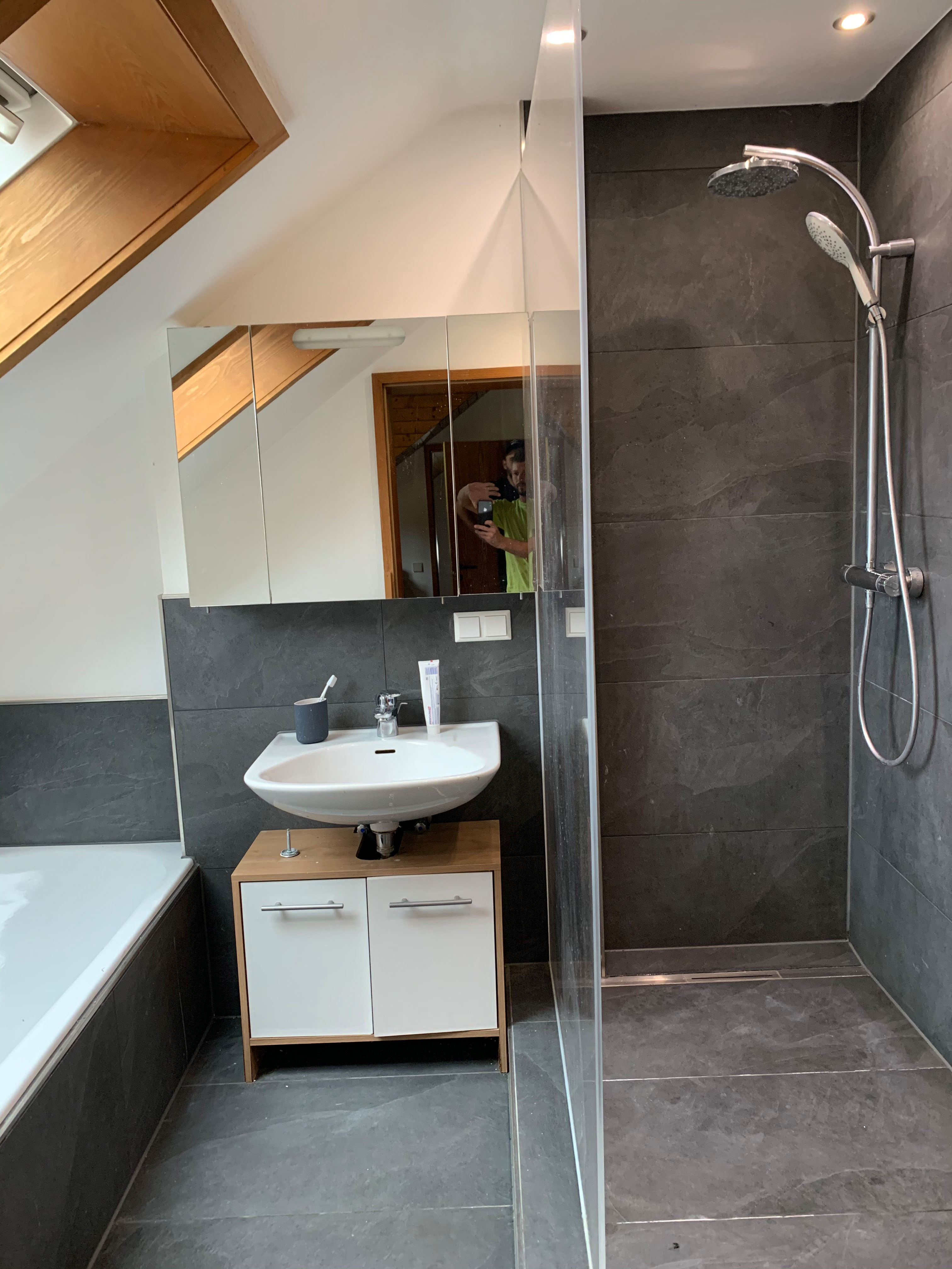 Bad und Toilette Bei diesem Projekt war es uns wichtig, den Stil der Gästetoilette mit der Optik des Badezimmers abzustimmen. Durch den Einsatz großformatiger Fliesen sind zwei moderne Räume mit gutem Wohlfühlcharakter entstanden.